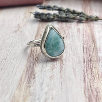 The gemstone is teardrop shaped and is in a sterling silver bezel setting. The ring band has a textured finish.