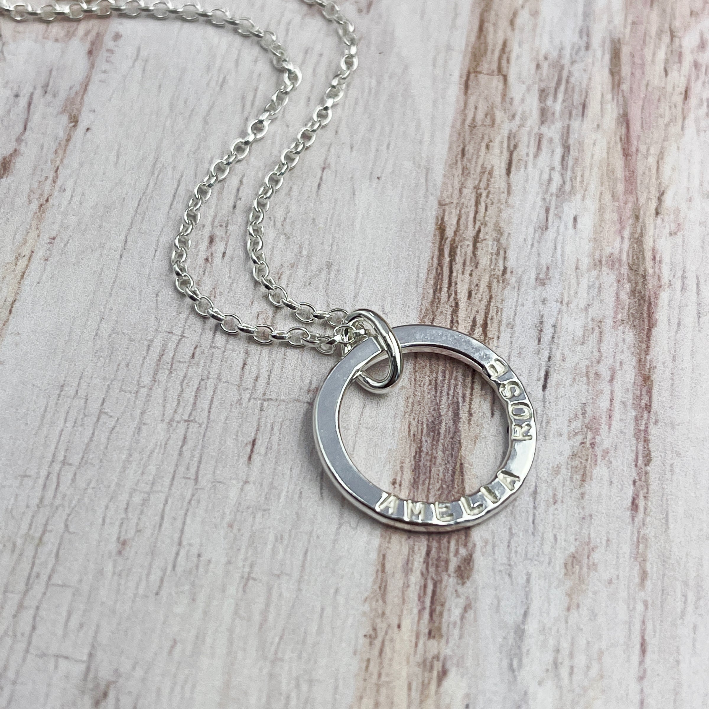 I can fit 20 letters per ring including spaces. The names are stamped in an uppercase modern font and the letters are 1.5mm high.