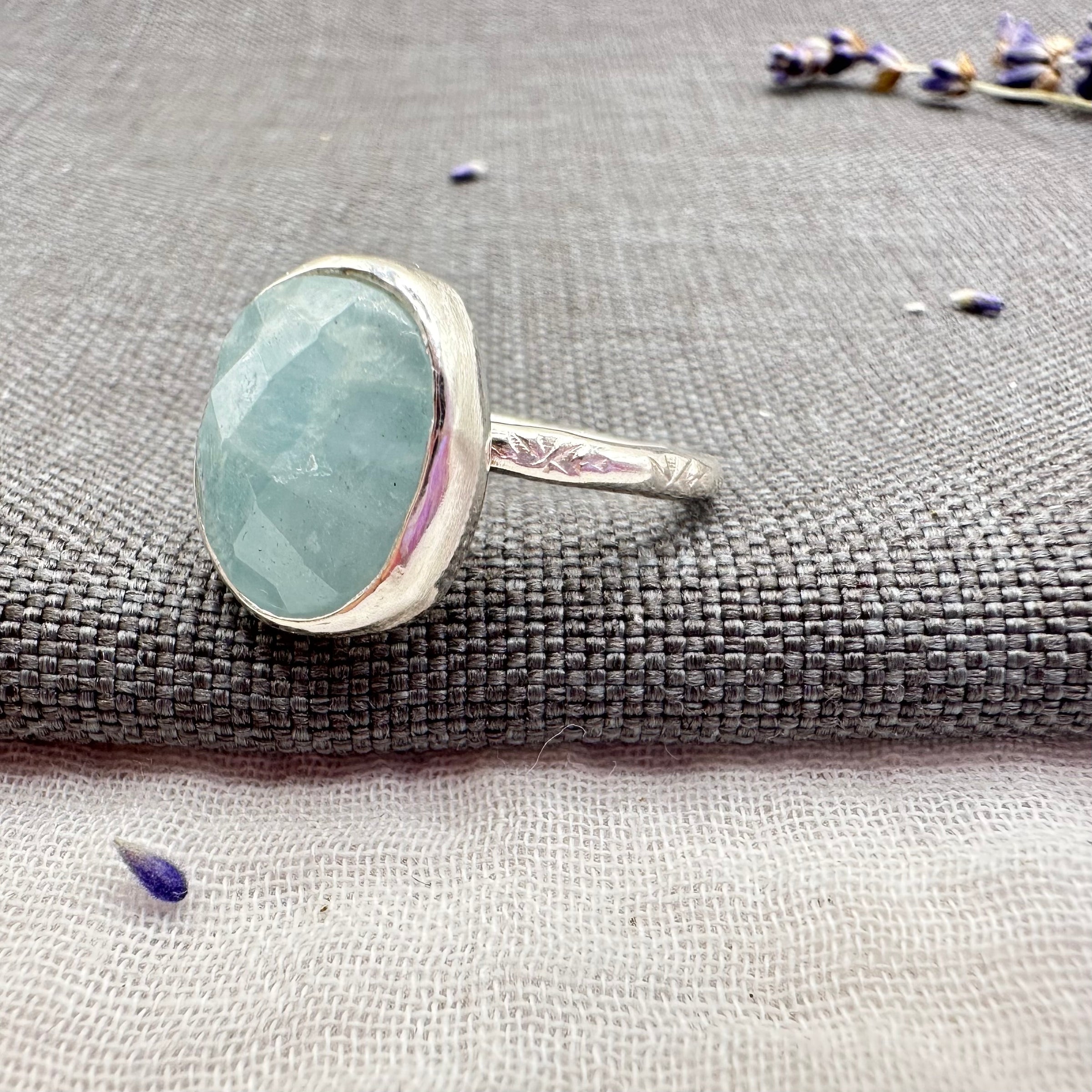 Beautiful Aquamarine in an oval shape with a faceted rosecut top. The gemstone is set in a handmade sterling silver bezel, and the ring band has a delicate pattern around its edge.