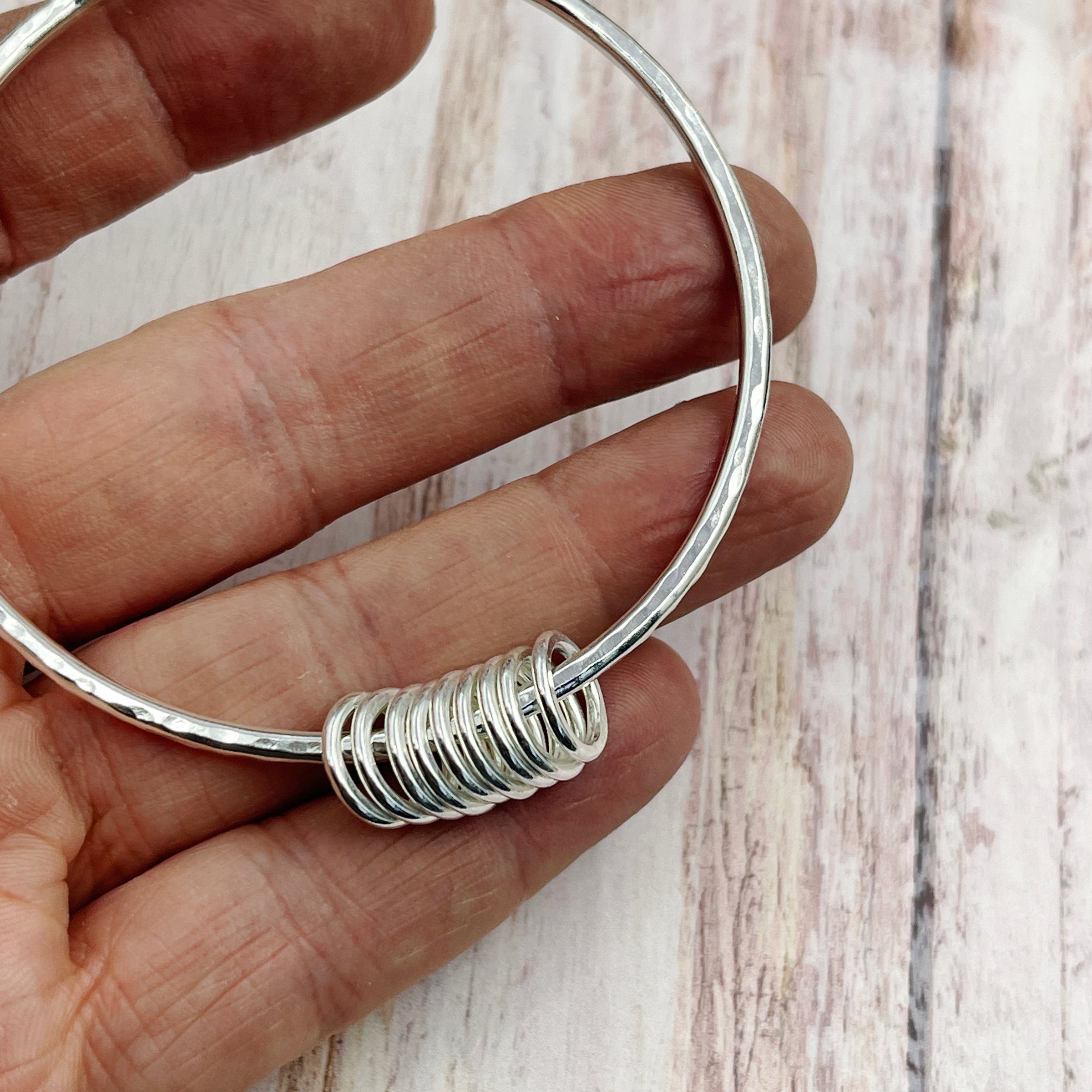 This bangle has 9 rings spinning around it, to represent a 90th birthday or a special occasion needing 9 rings.